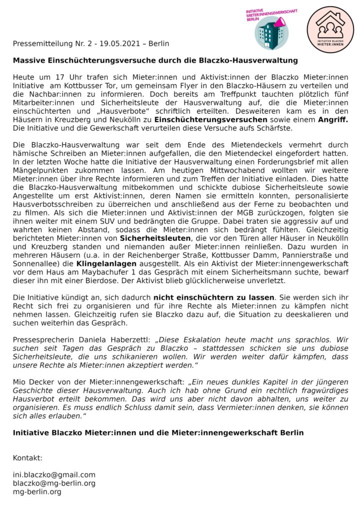 Die Blaczko-Hausverwaltung war seit dem Ende des Mietendeckels vermehrt durch hämische Schreiben an Mieter:innen aufgefallen, die den Mietendeckel eingefordert hatten. In der letzten Woche hatte die Initiative der Hausverwaltung einen Forderungsbrief mit allen Mängelpunkten zukommen lassen. Am heutigen Mittwochabend wollten wir weitere Mieter:innen über ihre Rechte informieren und zum Treffen der Initiative einladen. Dies hatte die Blaczko-Hausverwaltung mitbekommen und schickte dubiose Sicherheitsleute sowie Angestellte um erst Aktivist:innen, deren Namen sie ermitteln konnten, personalisierte Hausverbotsschreiben zu überreichen und anschließend aus der Ferne zu beobachten und zu filmen. Als sich die Mieter:innen und Aktivist:innen der MGB zurückzogen, folgten sie ihnen weiter mit einem SUV und bedrängten die Gruppe. Dabei traten sie aggressiv auf und wahrten keinen Abstand, sodass die Mieter:innen sich bedrängt fühlten. Gleichzeitig berichteten Mieter:innen von Sicherheitsleuten, die vor den Türen aller Häuser in Neukölln und Kreuzberg standen und niemanden außer Mieter:innen reinließen. Dazu wurden in mehreren Häusern (u.a. in der Reichenberger Straße, Kottbusser Damm, Pannierstraße und Sonnenallee) die Klingelanlagen ausgestellt. Als ein Aktivist der Mieter:innengewerkschaft vor dem Haus am Maybachufer 1 das Gespräch mit einem Sicherheitsmann suchte, bewarf dieser ihn mit einer Bierdose. Der Aktivist blieb glücklicherweise unverletzt.